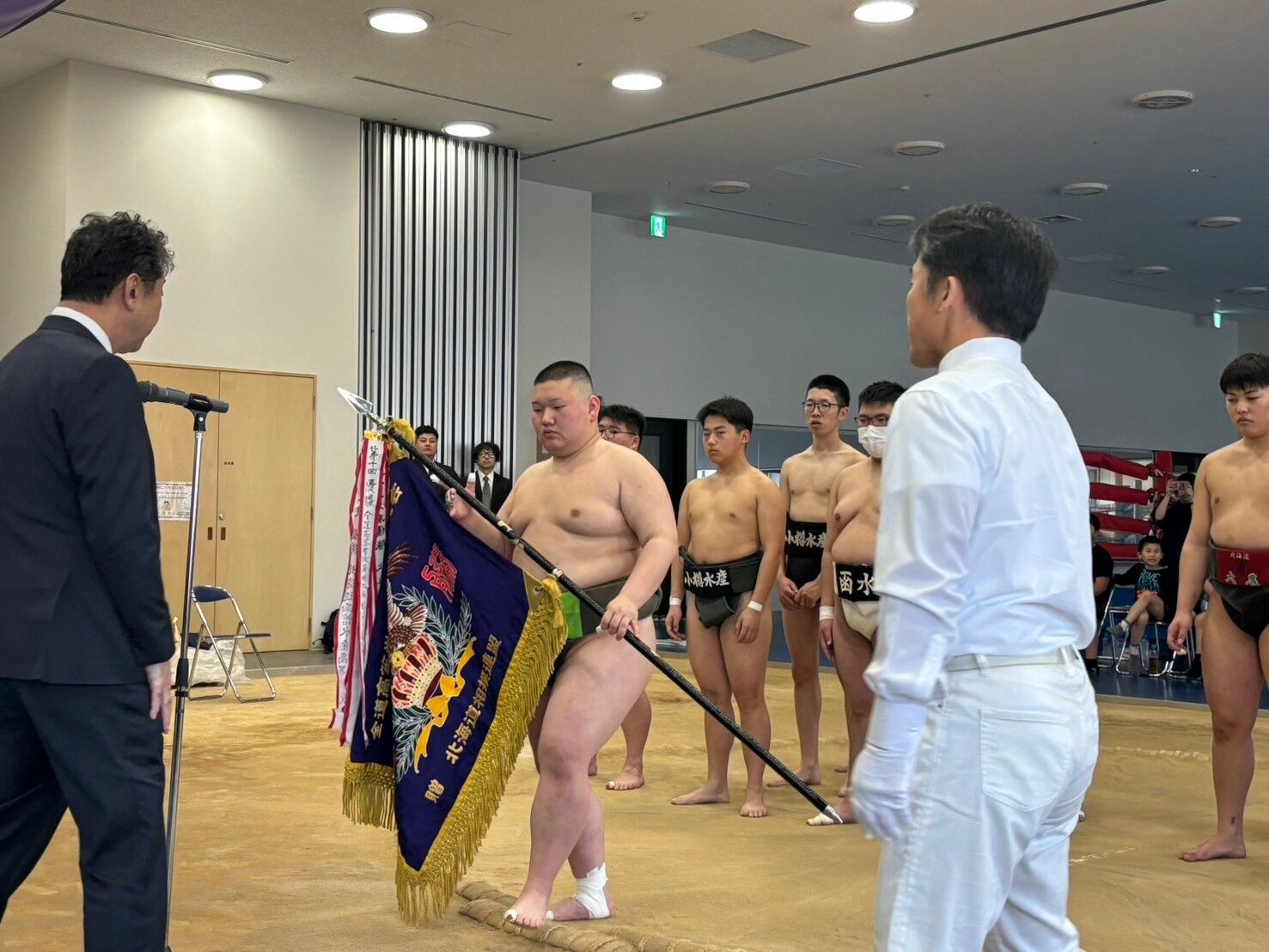 優勝旗を受け取る竹山主将。無事に優勝旗を持ち帰ることができました。