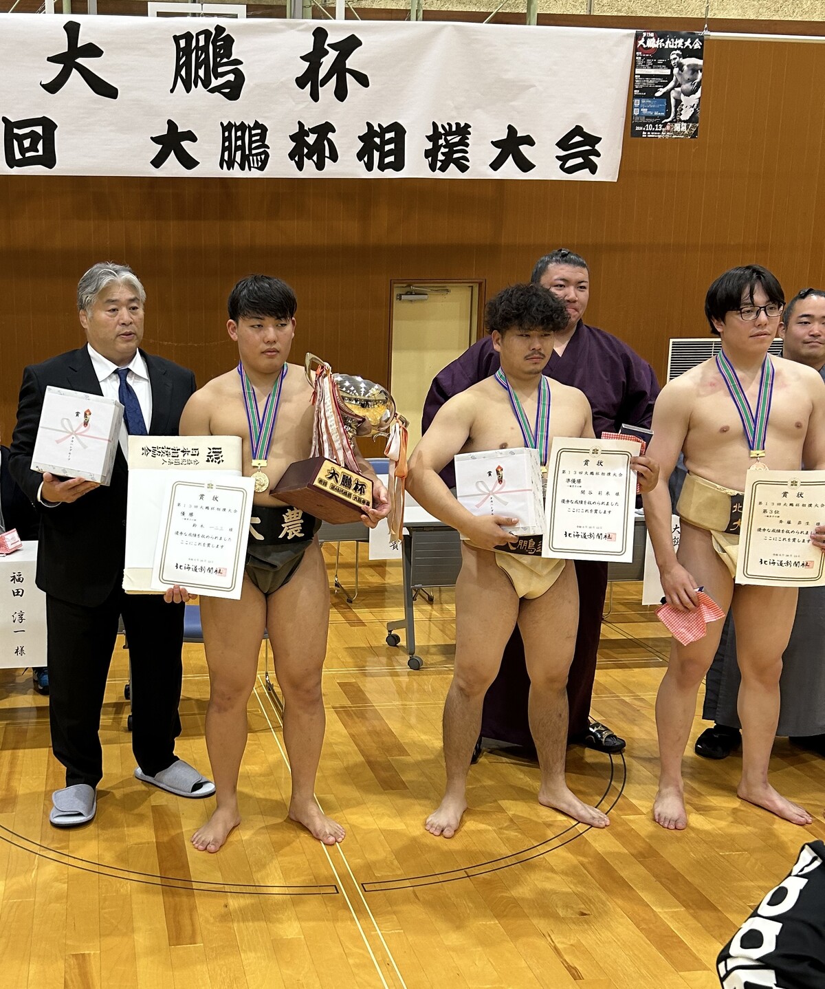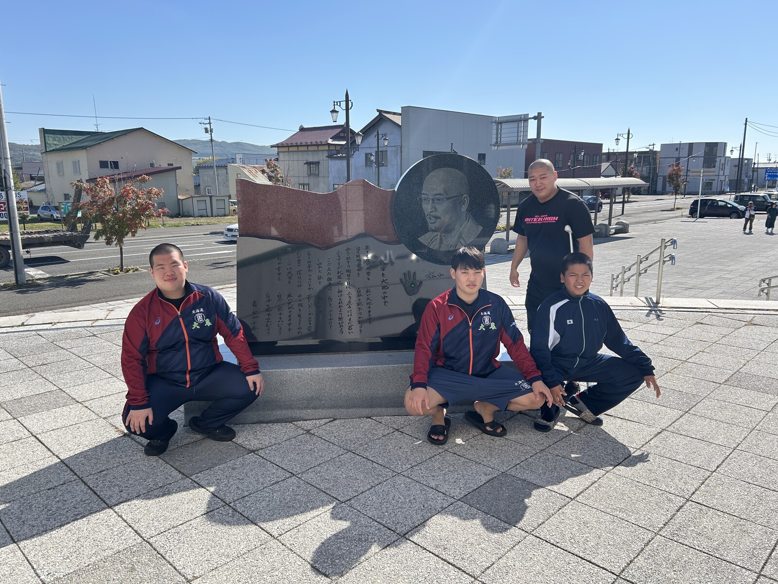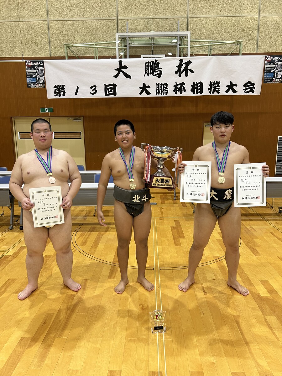 今回出場したのは、原田樹希(3年)・鈴木一二三(2年)と中学生の部に北斗市相撲少年団から阿保幸琉くん(中1)の3名です。